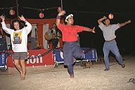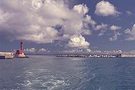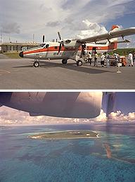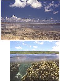 波照間島 ハテルマは「果て」+「ウルマ」らしい。「ウルマ」とは珊瑚礁の意味らし いから『はての珊瑚礁の島』てな意味であろうか。 日本では最南端の有人島で ある。 波照間島に渡るには、琉球エアコミューターが一日に1便。安栄観光と しんざと観光のジェット船が1日に3便ずつ。波照間海運のフェリーが週に3便 。私は行きはジェット船に乗り、帰りは飛行機に乗りました。 波照間と石垣の間には、竹富島・黒島・新城島など八重山の島々があるので、 それらを海と空の両方から観察できるというのは、いいもんでしたね。 民宿『たましろ』 ‥‥とにかく飯がスゴい 行くまで知らなかったのだが、ここの民宿は飯の量が異常に多いということ で、八重山フリークの間では有名らしい。写真を見てもらえば分かると思うが、 とにかく何でもかんでも てんこ盛りなのだ。 はじめはみんなで分けて食うのかと思ったぞ。 ちなみに朝食もすごい! 並みの夕食ぐらい有るのでは無かろうか。さらに 朝食時にはテーブルにサランラップが置かれている。‥‥自分でおにぎりを作っ て昼食にしなさいということやねんね。恐れ入ります。 これで2食付き4500円は安いなぁ。部屋は普通の民家だけどね。 幻の泡波 ここの夕食は、玄関先でのガーデンパーティーだ。一人分ずつ盆に盛られた 超大盛りおかずをつつくわけだ。さらにシークワーサージュースとか午後の紅茶 だとかが一本ずつ付く。これはテーブルごとにおかれた泡盛を割るためのもの。 もちろんそのまま飲んでも(どっちも)良いんだけどね。 ここででてくる泡盛が『泡波』といって波照間島で作られているもの。生産 量が少なく、あっという間にジモティが買ってしまう。そのため、さして旨いわ けではないんだけど、そのためなかなか観光客のお土産にはならないので『幻の 泡盛』と呼ばれている。 大泊浜でケガる 宿のオバチャンに教えてもらった大泊浜で泳ぐ。 ここはあまりリーフが発達していないのか、波があって泳ぎにくかった。サ ンゴとサンゴの間を縫うように泳いでいる上、カメラを持っているので、ちょっ と大きめの波を受けると体勢が崩れてしまうのだ。今回、この浜が初めてのシュ ノーケルとなったのだが、1回目にして、早くもケガをしてしまった。手首を思 いっきりサンゴに打ちつけてしまったのだ。その時、痛いことは痛かったが、表 面上は何ともなかったのだが、後になって腫れてきて、発疹ができて気味が悪か った。2日後、与那国島の診療所で診察してもらうが、1週間ほど腫れは退かな かった。 皆さん、サンゴを含めて毒のある海中生物に注意しましょう。 サトウキビとハイビスカスの島 宿の自転車を借りて、波照間島を一周をする。離島振興のための公共工事で できた一周道路に沿って走る。まわりは一面サトウキビ。サトウキビは背が2m 以上になるので、見通しが悪い。それでも道路の上にぽっかりと空いた青空と道 路の彼方に浮かぶ入道雲とのコントラストは美しいもんだ。 また道路沿いにはハイビスカスが植樹されていて、赤・ピンク・黄色と色と りどりに咲いている。 集落はどこの島とも同じように赤瓦の家が建ち並ぶ。が、この島は屋根の上 にシーサーが乗っていない。辻々にあるハズの石敢当も少ない。 集落にある売店は正午から2時半まで店を閉める。 理由は暑いから。 昼過ぎの一番暑い頃は昼寝をする時間なのだろう。あくせく動き回っている のは観光客くらいのものか。 最南端の碑 最南端の展望台で強い風を受けながらパンをかじった。気持ちよし。 最南端の地を高那という。リーフが切れていて波が直接断崖にあたり、高い 波となるからだという。 ここには『日本最南端の碑』がある。碑へ行くためのプロムナードが変わっ ていて、全国から集められた石を2列に敷き詰め、2本の紐が最後に結んである かのように見せている。ふたたびこの島が他国の占領下に置かれることの無いよ うにとの願いから出来たものだという。 学童慰霊の碑 西表島を臨む、島の北側の小高い丘を登りきったところに学童慰霊の碑があ る。これは戦争末期に西表島に強制疎開させられた住民の多くがマラリアで死ん でいったことに由来するもので、もちろんその中には多くの子どもたちがいた。 西表島の南風見田の浜にも同様の碑、忘勿石がある。 波照間小学校の周囲の壁には卒業生の卒業作品として、ウォールペインティ ングがある。その一つに『星になった子どもたち』という詩があった。 コンサート 偶然、波照間島で野外コンサートがあった。 島の中央の広場でトラック2台の荷台を使って作った にわか仕立てのステ ージだ。なんでも島の電気屋が儲けた金を地元に還元するという名目で開いたら しい。島民はゴザを持ち寄って舞台のまわりに座る。周囲では泡波や刺身の販売 が行われていて、こじんまりとしたお祭りムードになっていた。 コンサートを開くのは大島ヤスカツという人で、石垣島の出身らしい。ポ